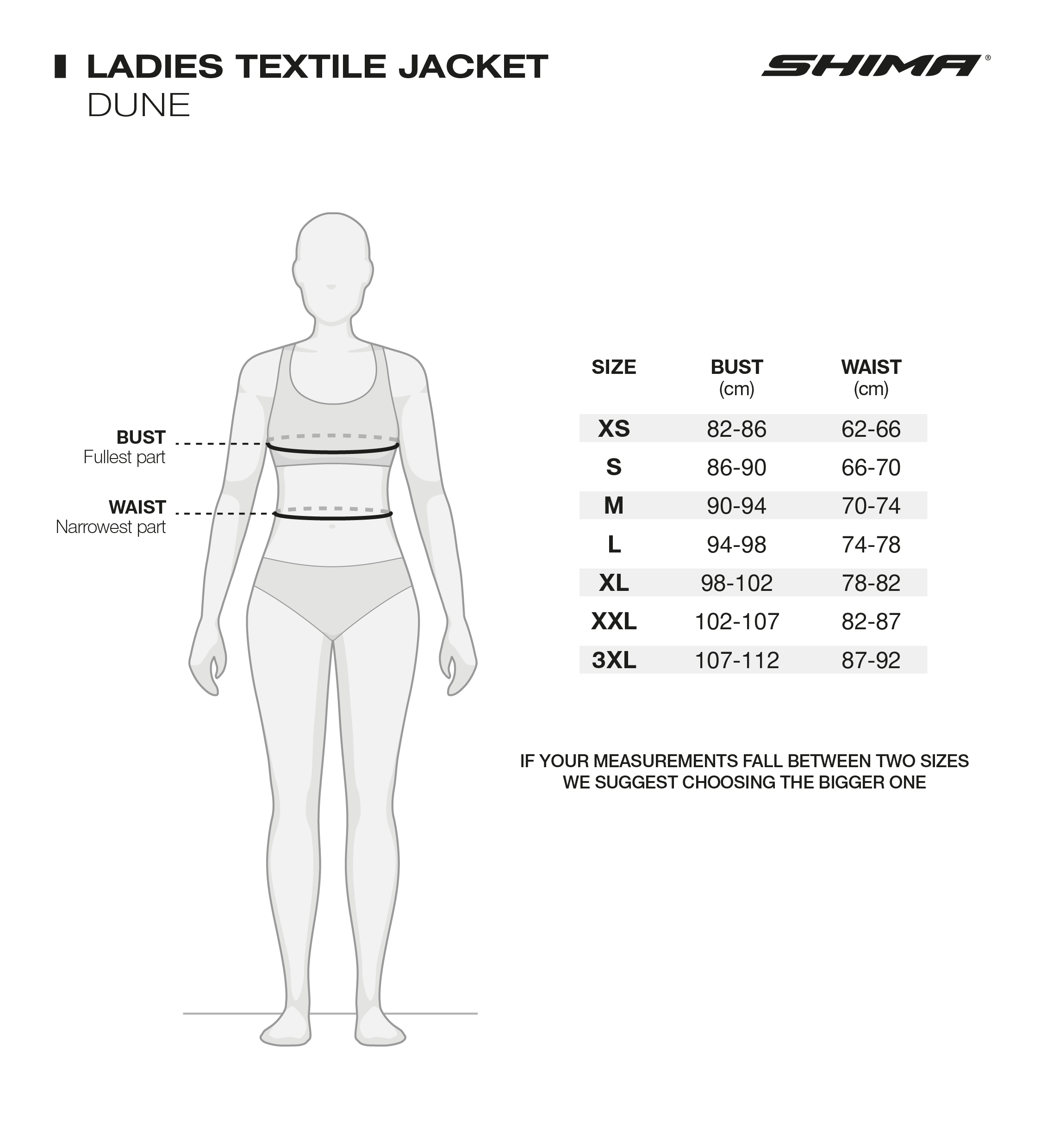 La giacca SHIMA DUNE LADY offre un'elevata protezione grazie alle più recenti protezioni SHIMA. Dotata di protezioni avanzate di livello 2 per la schiena, le spalle e i gomiti, la giacca offre una regolazione in altezza in 3 posizioni delle protezioni dei gomiti per una vestibilità perfetta per ogni corporatura. La tecnologia DuoLayer Protection™ nelle aree a rischio di impatto e il resistente tessuto di rinforzo sotto le protezioni aumentano notevolmente la resistenza a strappi e abrasioni. Il materiale ripstop rinforza ulteriormente l'intera struttura per una maggiore resistenza ai danni. Certificato a livello AA, lo SHIMA DUNE LADY garantisce la massima sicurezza in ogni chilometro.