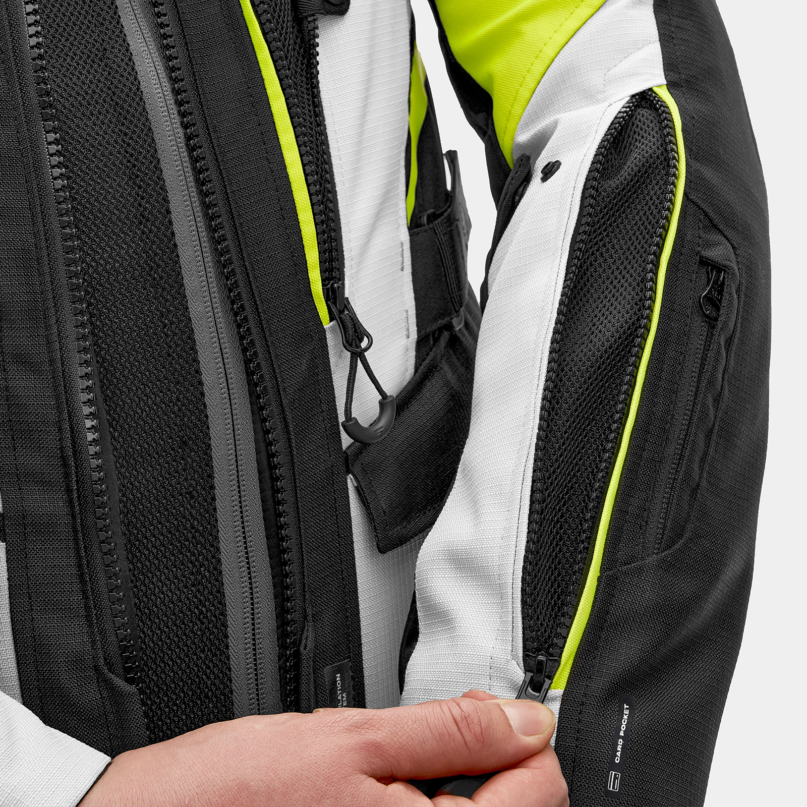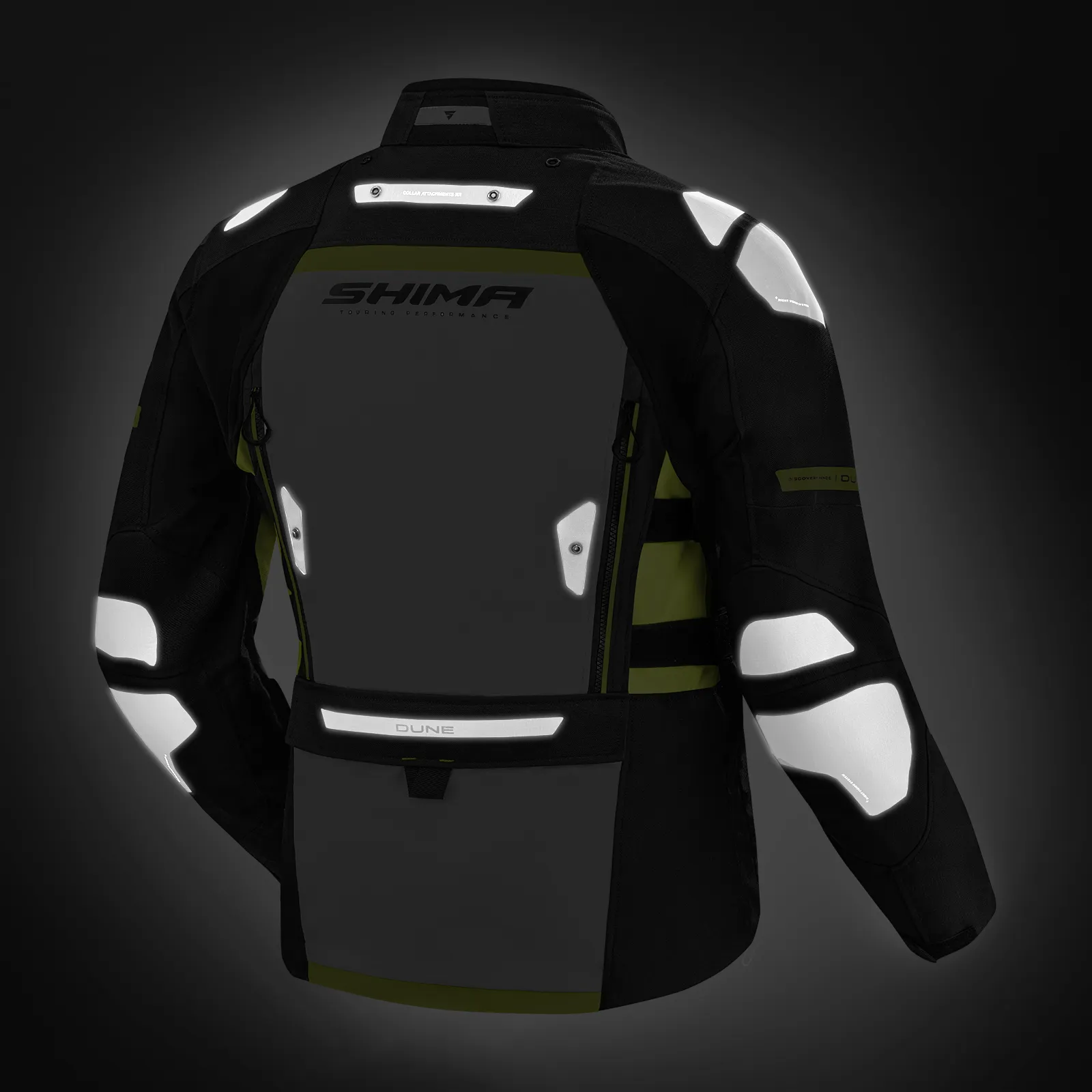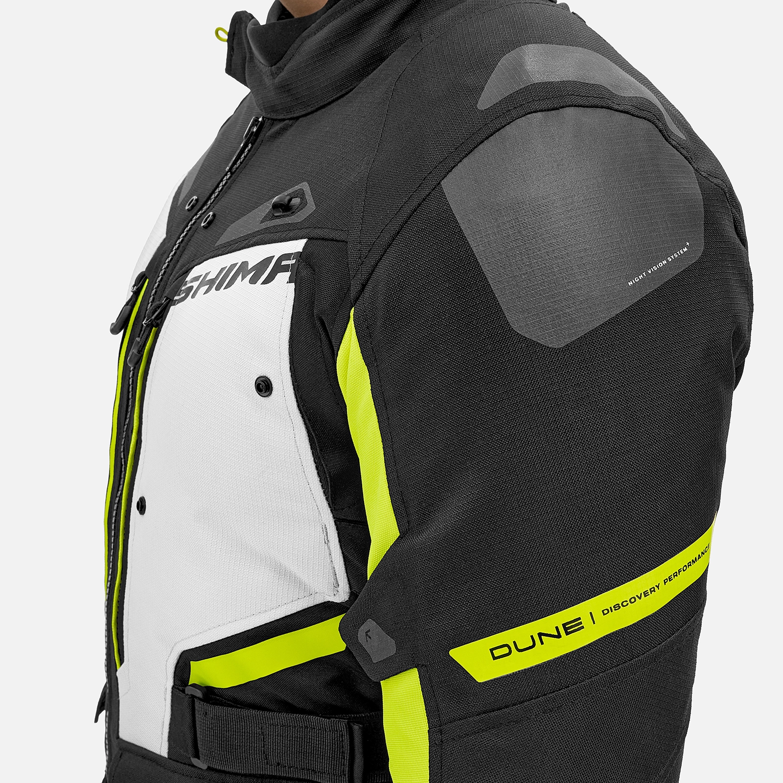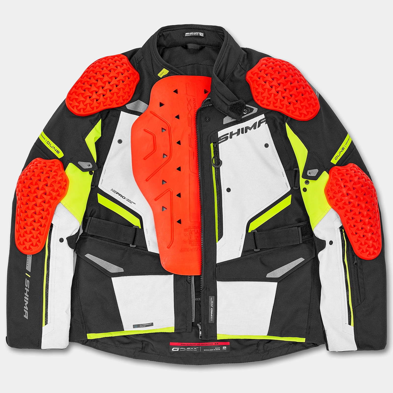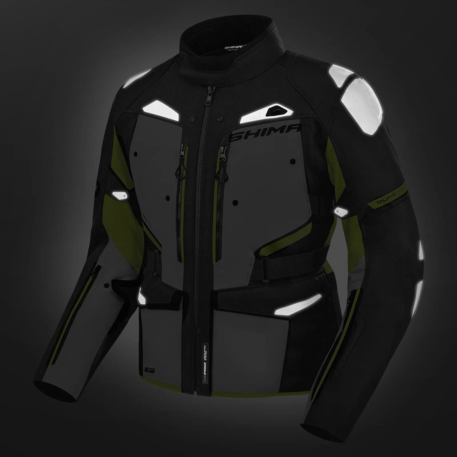 La giacca SHIMA DUNE offre un'elevata protezione grazie al DuoLayer Protection™ nelle aree a rischio di impatto. La costruzione, che consiste in un rinforzo in tessuto resistente sotto le protezioni, aumenta notevolmente la resistenza a strappi e abrasioni. La giacca è dotata delle nuove protezioni GFLEXX di livello 2 per la schiena, le spalle e i gomiti ed è dotata di una regolazione dell'altezza delle protezioni dei gomiti in 3 posizioni per una perfetta aderenza a qualsiasi corporatura. Il materiale ripstop rinforza ulteriormente l'intera struttura, garantendo una maggiore durata contro i danni meccanici. Il sistema Night Vision™, un'avanzata tecnologia riflettente, aumenta la visibilità dopo il tramonto, il che si traduce in sicurezza passiva durante la guida. La giacca SHIMA DUNE soddisfa la certificazione di sicurezza europea di livello AA.