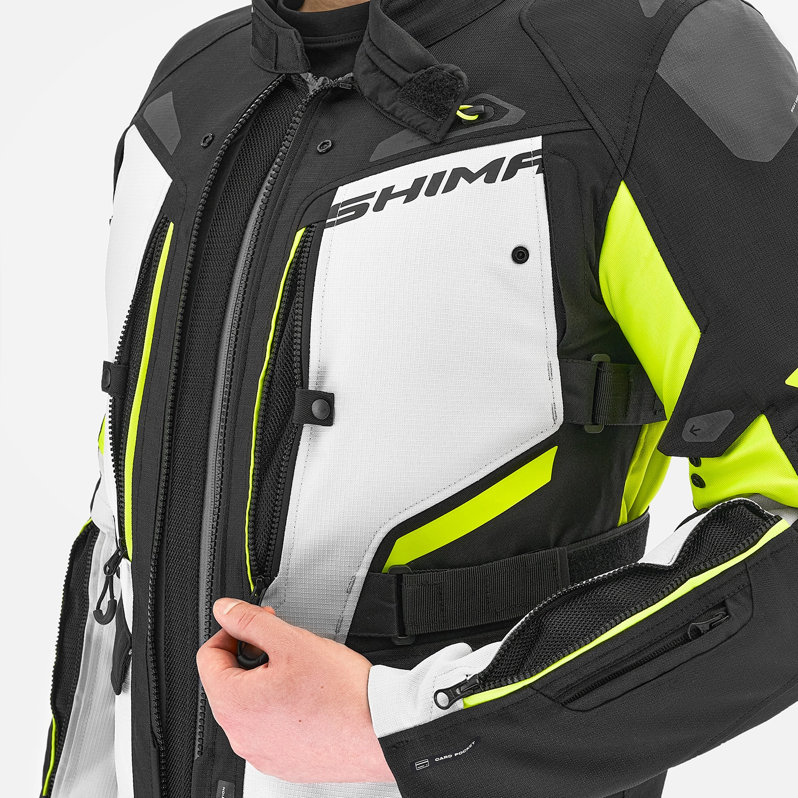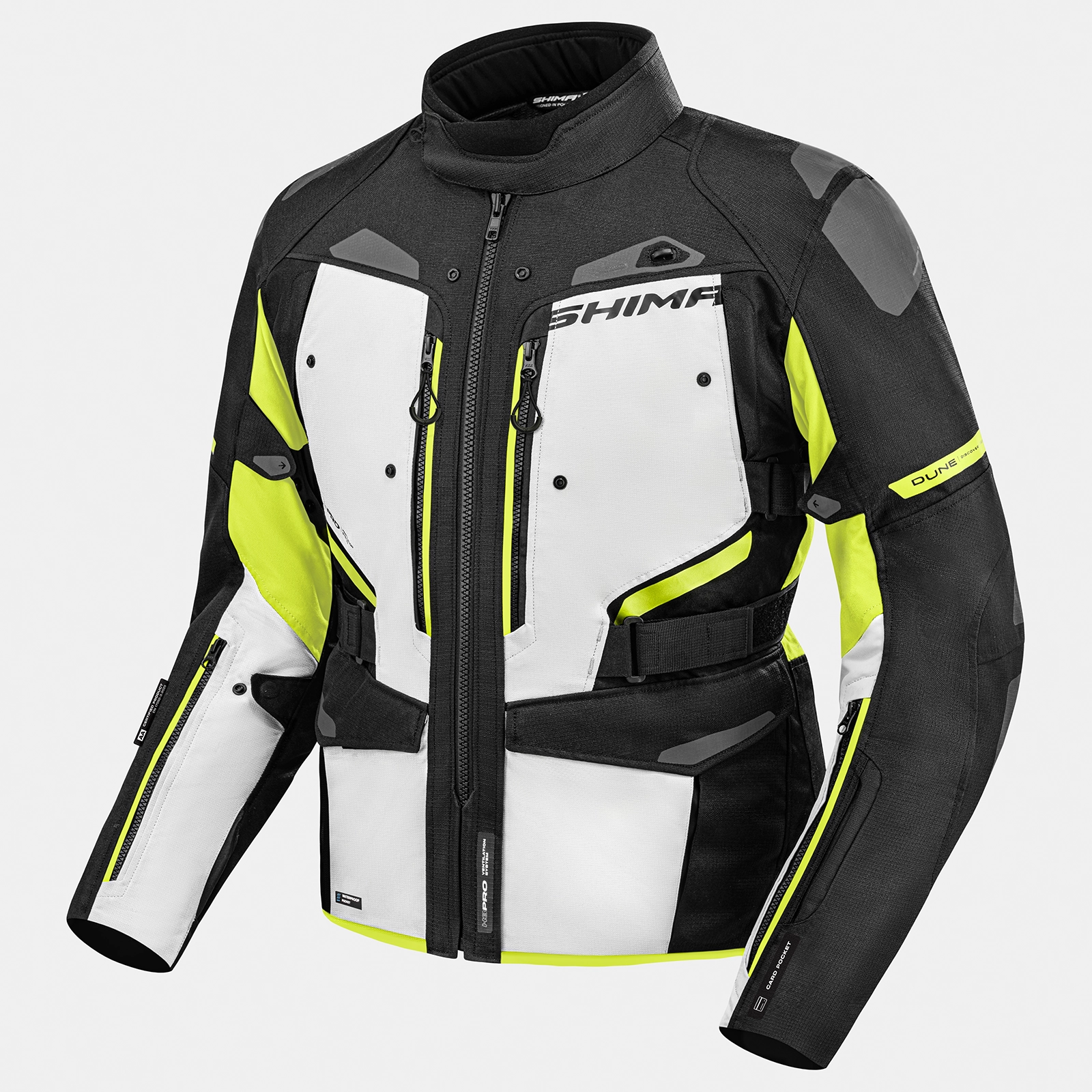 La SHIMA DUNE è una giacca ideale per tutte le stagioni grazie alla sua costruzione a tre strati. È composta da uno strato di base, dalla membrana impermeabile NextDry™ di ultima generazione con fodera laminata e da un gilet isolante, che consente un facile adattamento alle mutevoli condizioni atmosferiche. Il sistema H3 Pro™, che consiste in una grande presa d'aria in setola accanto alla cerniera principale, consente di aprire rapidamente la circolazione dell'aria, anche durante la guida. Numerosi pannelli di ventilazione verticali, situati sul petto e sulla schiena, e lunghe cerniere di ventilazione sugli avambracci, garantiscono un'eccellente ventilazione e comfort termico quando si pedala nelle giornate più calde.