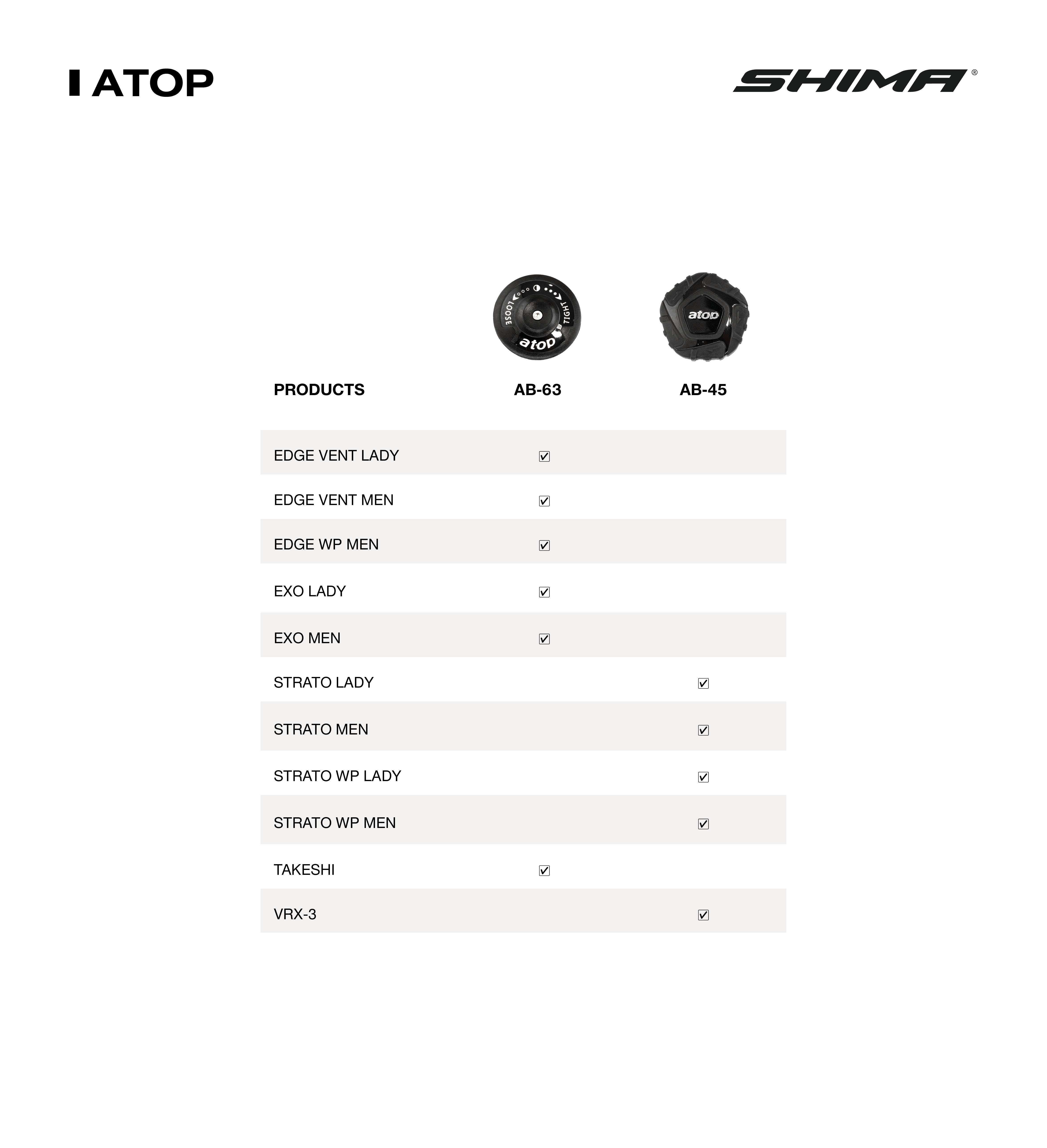 Kit di riparazione ATOP SET A-B45 e A-B63, compatibili con i modelli EXO MEN, EXO LADY, VRX-3, EDGE WP, EDGE VENTED, EDGE LADY, TAKESHI, STRATO MEN WP, STRATO MEN, STRATO LADY e STRATO LADY WP. Contengono gli elementi necessari e le istruzioni per la sostituzione e consentono una rapida riparazione del sistema di attacco ATOP nelle scarpe SHIMA.