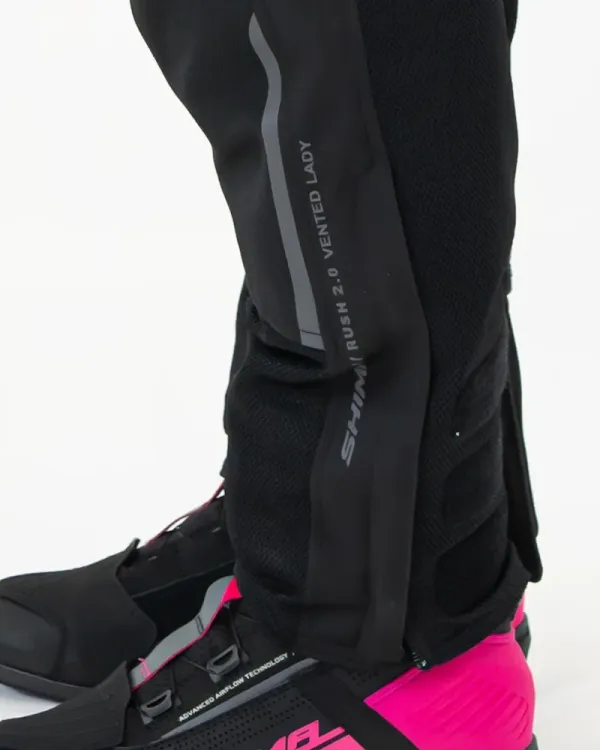 I pantaloni RUSH 2.0 VENTED Lady sono stati progettati per garantire il massimo comfort durante la guida. Sono dotati di una gamba e di una vita regolabili con cerniera e chiusure a gancio. Ciò consente di regolarli perfettamente in base alle proprie esigenze e preferenze. La costruzione Comfort+ senza cuciture assicura che le aree principali siano prive di cuciture spesse che potrebbero causare disagio durante le corse più lunghe. I pantaloni sono dotati di due cerniere di chiusura: 360° e una cerniera corta, che consentono di abbinare la giacca a qualsiasi giacca SHIMA, in particolare al modello dedicato RUSH 2.0 Lady.