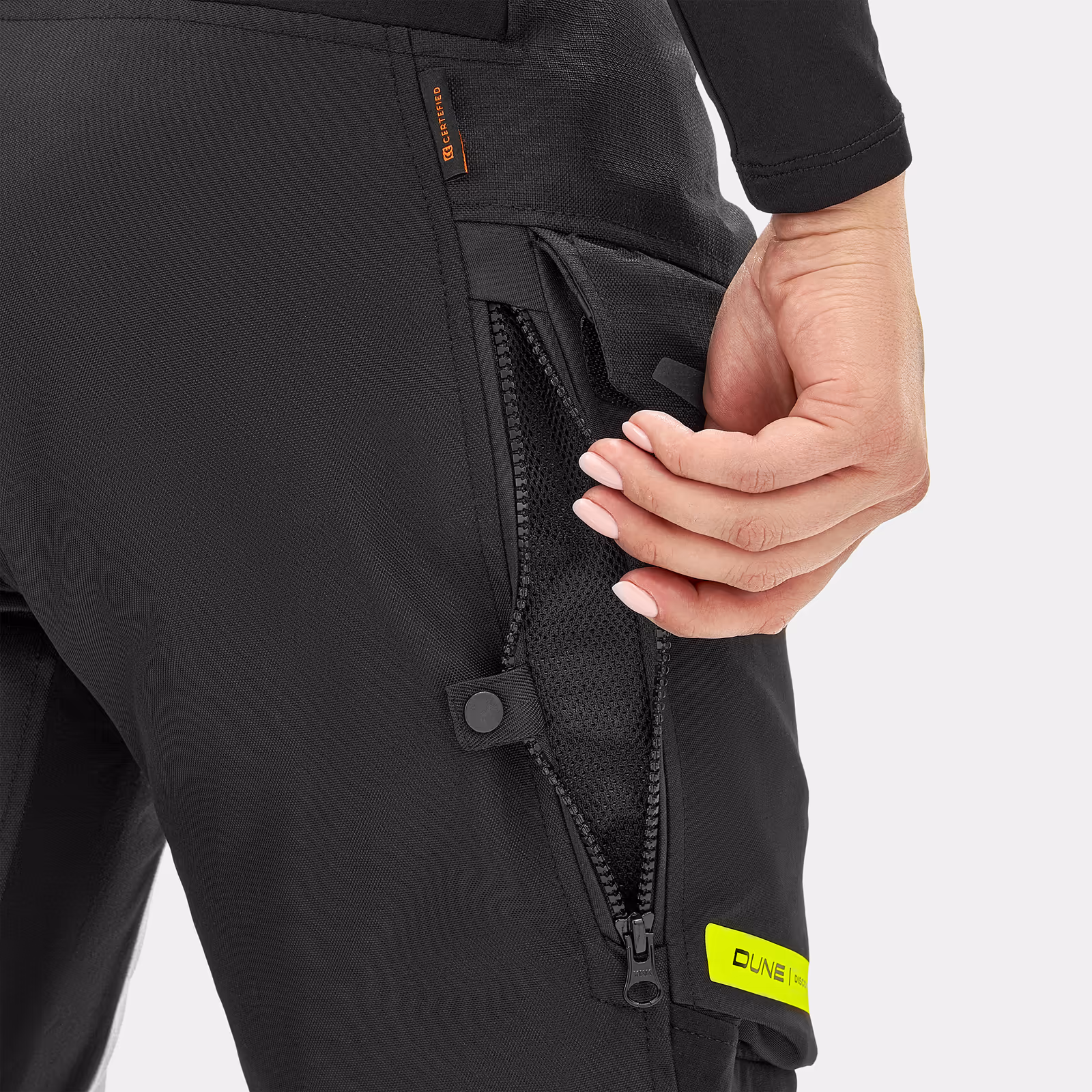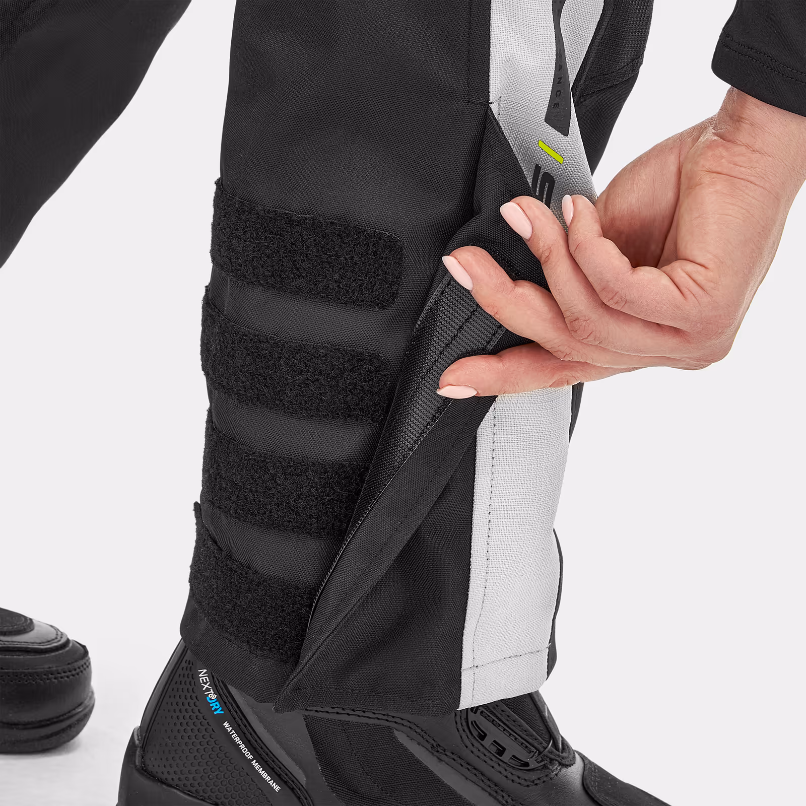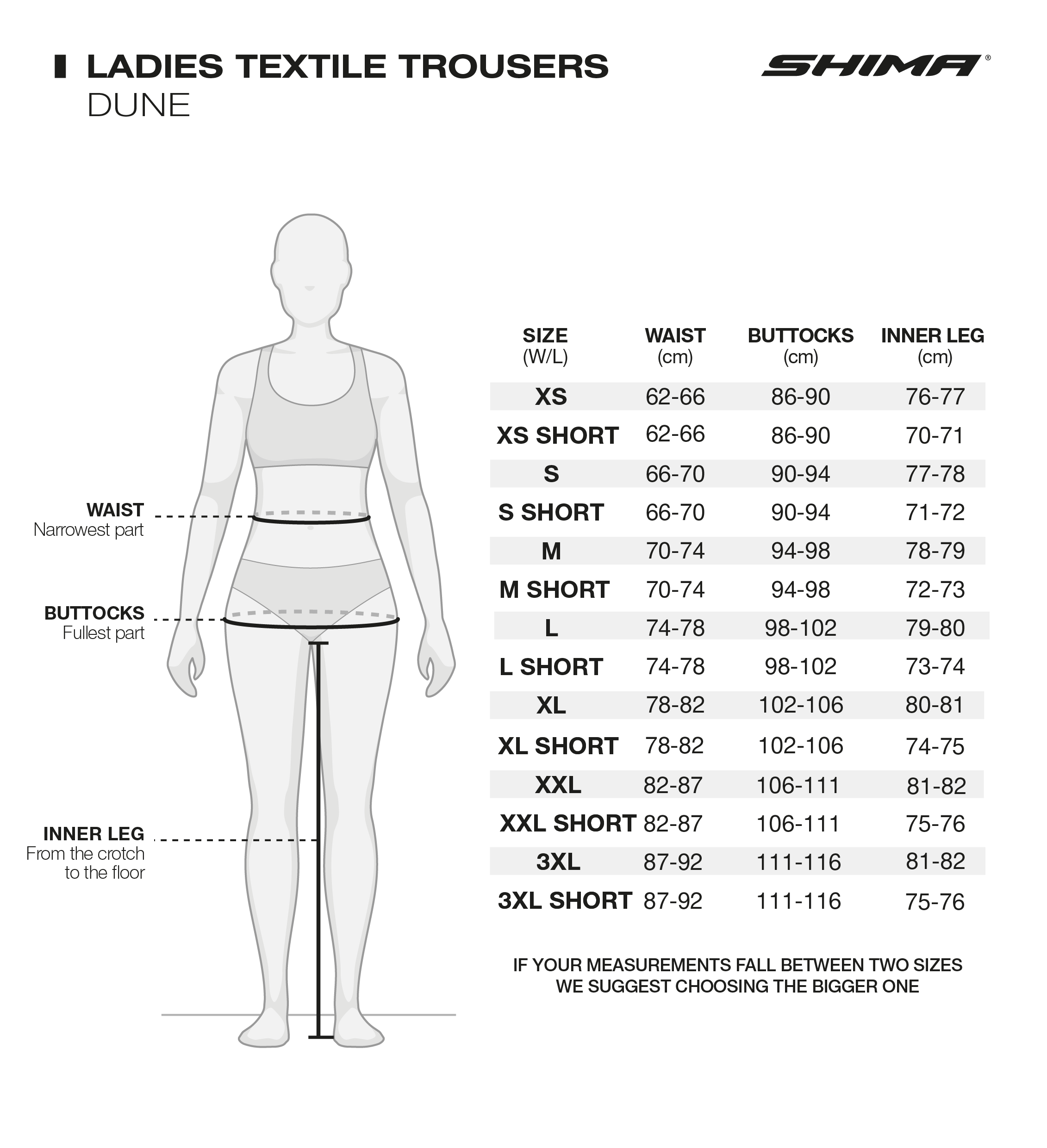 SHIMA DUNE LADY è un pantalone da moto da turismo progettato specificamente per le donne, che offre una vestibilità perfetta grazie alla costruzione Lady Fit. Realizzati in resistente materiale RIPSTOP®, offrono un'eccezionale resistenza a strappi e abrasioni, garantendo la massima sicurezza sul percorso. Dotati di protezioni SHIMA GFLEXX di livello 2 per i fianchi e SHIMA GFLEXX di livello 2 per le ginocchia, regolabili su tre livelli di altezza, consentono di adattare la protezione alle esigenze di ogni motociclista. Grazie alla costruzione a due strati, che comprende uno strato di base e una membrana impermeabile NextDry™ staccabile, i pantaloni SHIMA DUNE LADY si comportano bene in diverse condizioni atmosferiche. I pannelli di ventilazione verticali sulle cosce, fissati con bottoni automatici, assicurano una circolazione ottimale dell'aria. Progettati per il massimo comfort, i pantaloni DUNE LADY sono disponibili sia in versione classica che accorciata, per una perfetta vestibilità delle diverse silhouette. Le regolazioni in velcro sulle ginocchia, sulle estremità delle gambe e sui fianchi consentono di regolare la circonferenza, garantendo una completa libertà di movimento. I pantaloni SHIMA DUNE LADY offrono anche soluzioni pratiche come le tasche cargo impermeabili sulle cosce, che offrono ampio spazio per gli accessori essenziali. Il sistema Night Vision™ con catarifrangenti aumenta la visibilità durante la guida notturna, mentre la possibilità di aggiungere bretelle dedicate offre maggiore stabilità e comfort nelle lunghe uscite. Disponibili nelle taglie XS-3XL in lunghezza classica e ridotta, nei colori NERO, FLUO, ROSSO, i pantaloni SHIMA DUNE LADY sono la scelta perfetta per ogni motociclista donna che apprezza la sicurezza, il comfort e la funzionalità su percorsi di ogni lunghezza!